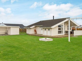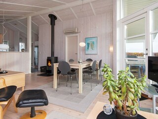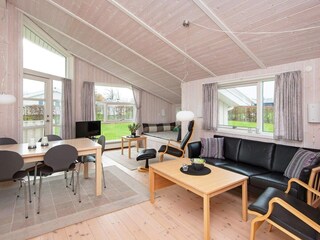 Maison de vacances de Flovt Strand avec salon et cuisine combinés avec poêle à bois et alcôve. De là, il y a un accès à une terrasse partiellement couverte. Dans le jardin il y a une...